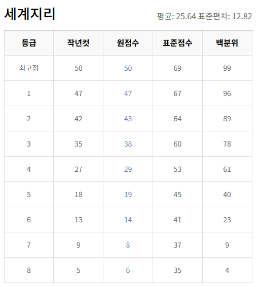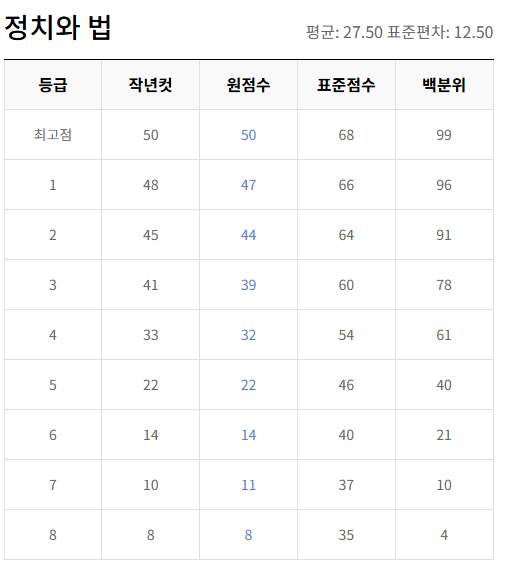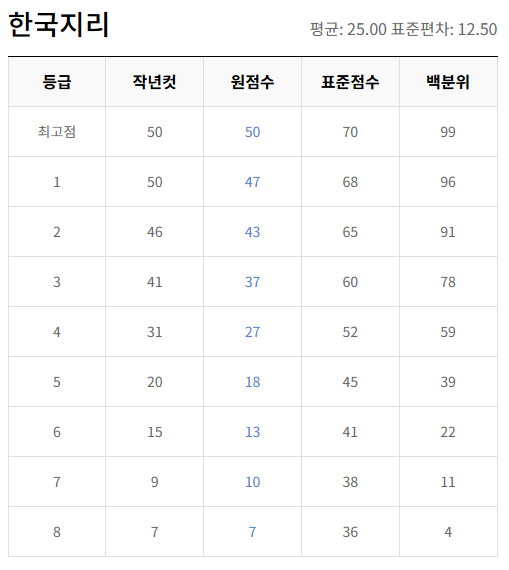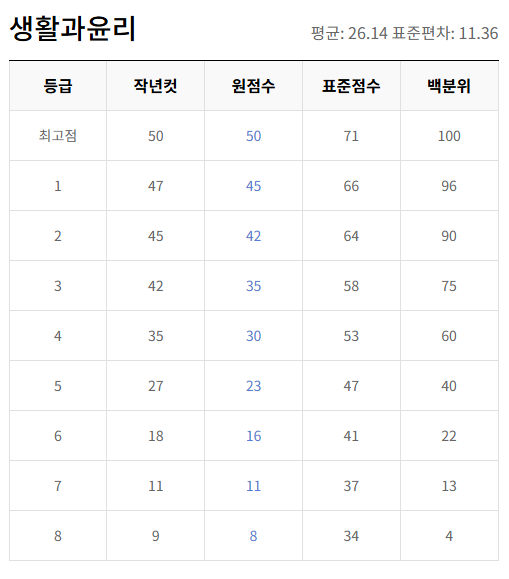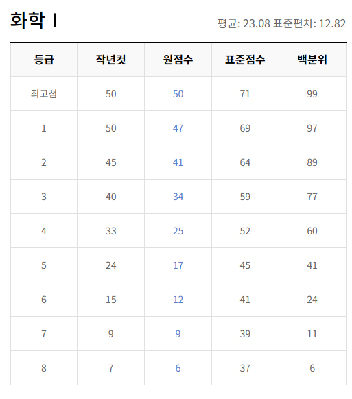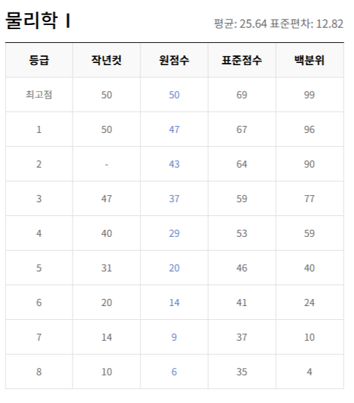 | 과목 | 원점수 만점 | 1등급 원점수 | 1등급 표준점수 | 비고 |