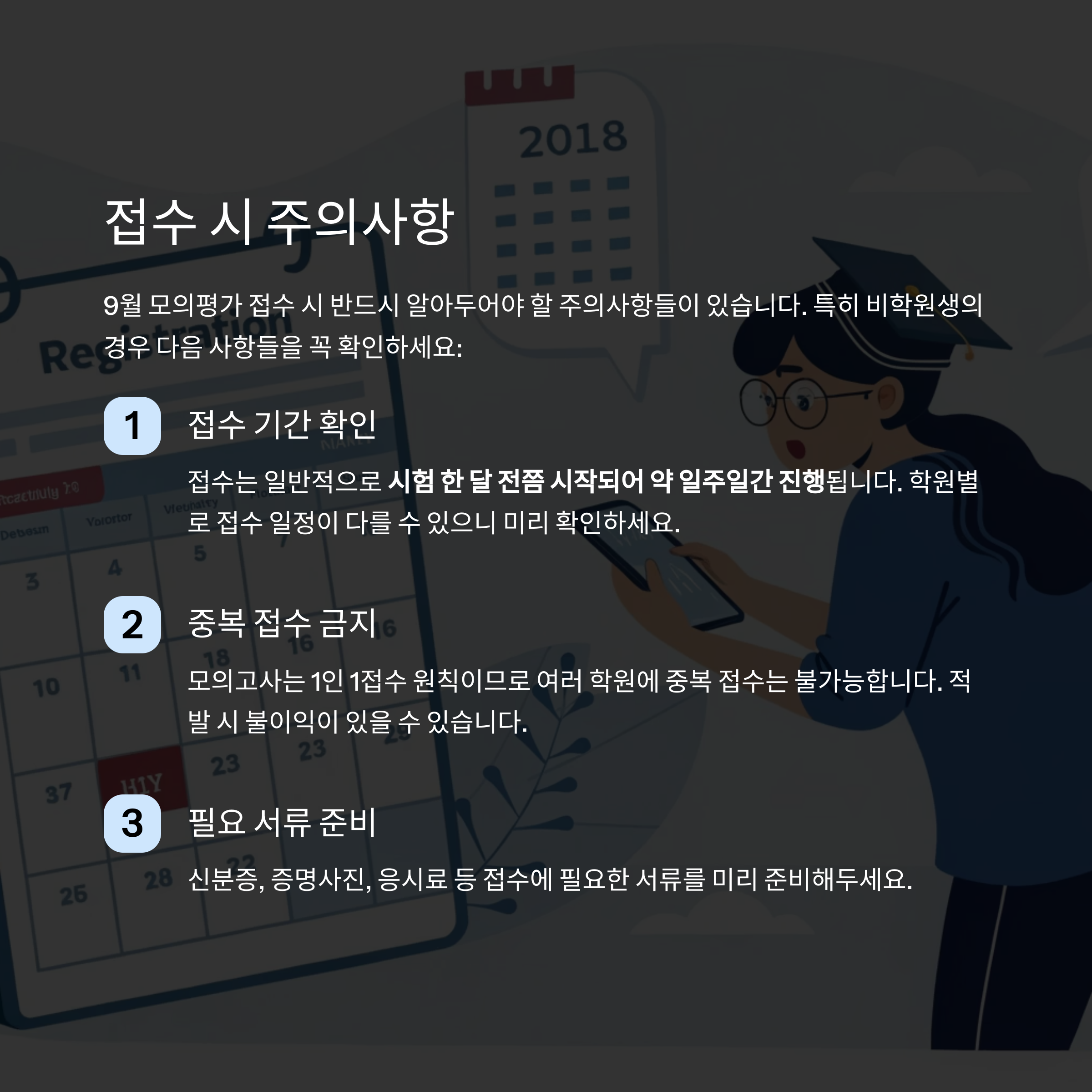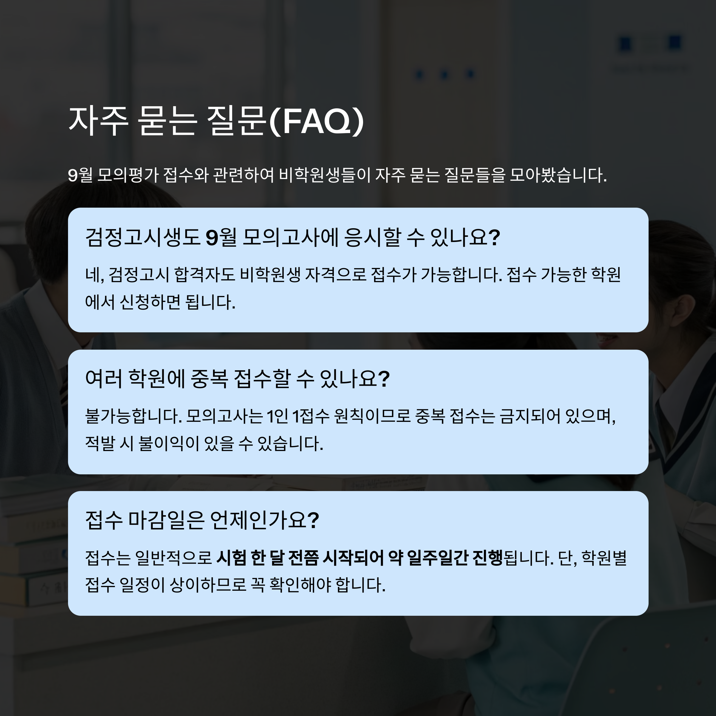 비학원생이더라도 자신이 졸업한 고등학교가 9월 모의평가에 참여하고 있는 경우, 해당 학교에 직접 연락하여 졸업생 자격으로 접수할 수 있습니다. 단, 일부 고등학교는 외부인의 접수를 받지 않거나, 재학생만 접수 가능한 경우도 있으니 사전 문의는 필수입니다.