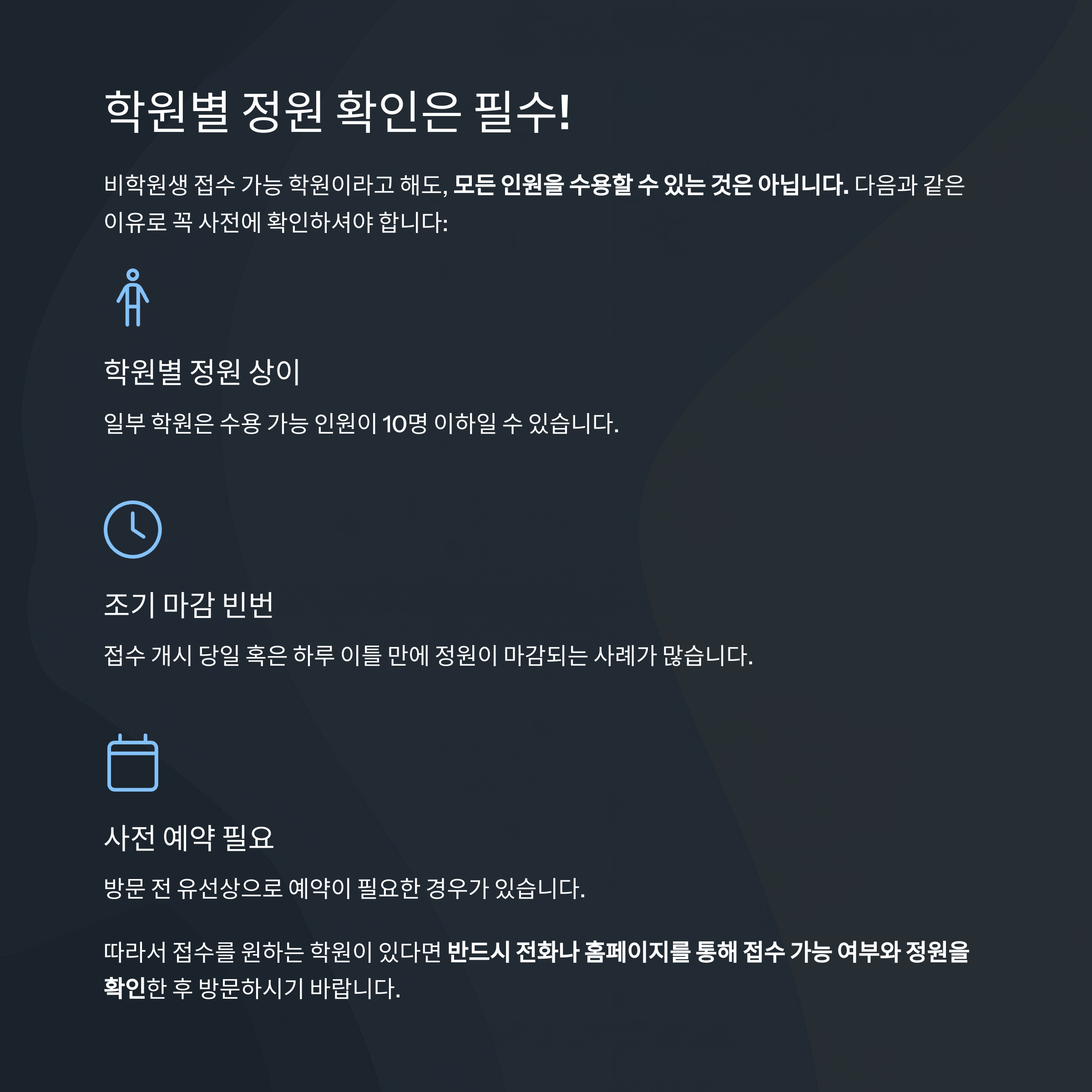 - 모든 학원이 비학원생 접수를 받는 것은 아니며, 접수 정원 및 기간이 제한됩니다.