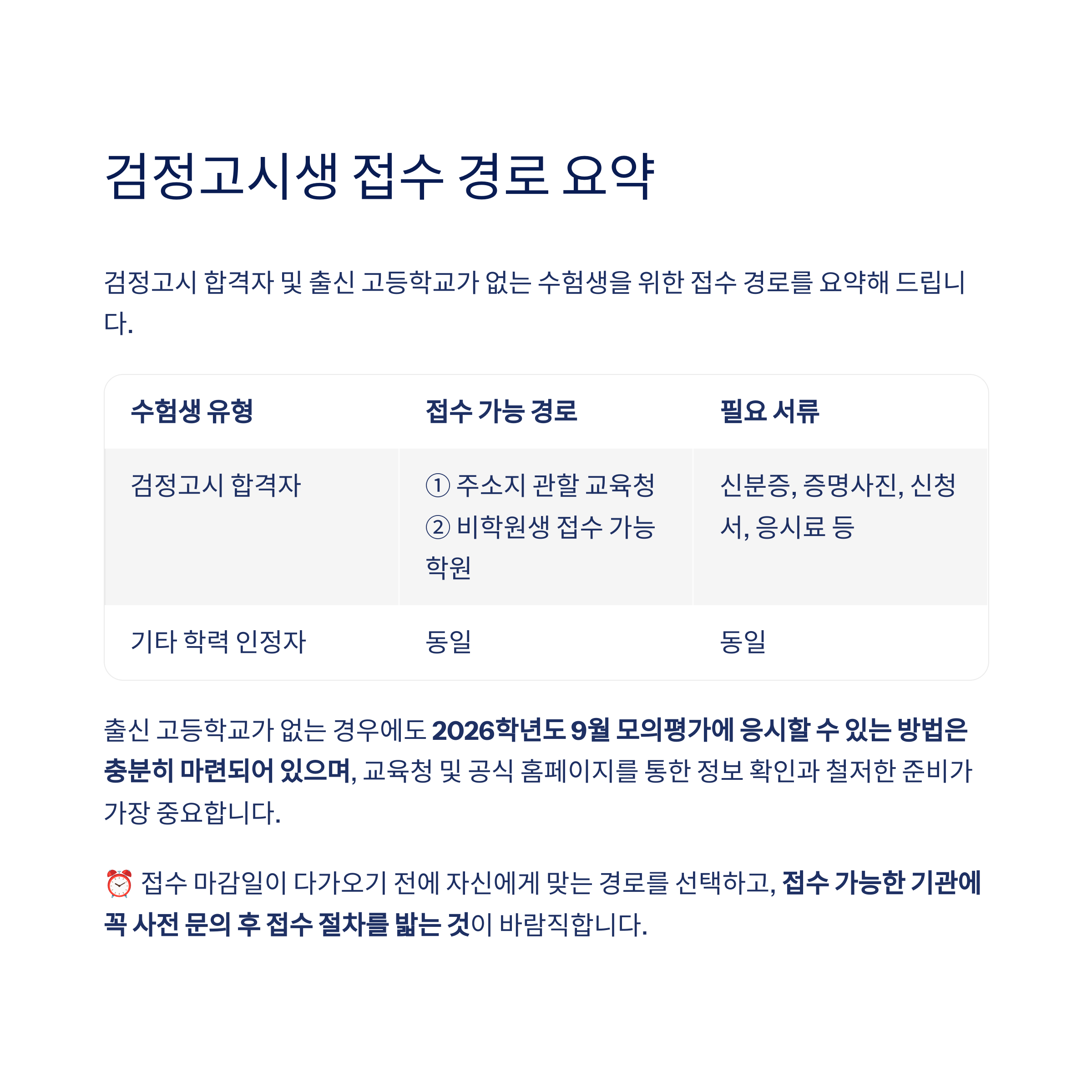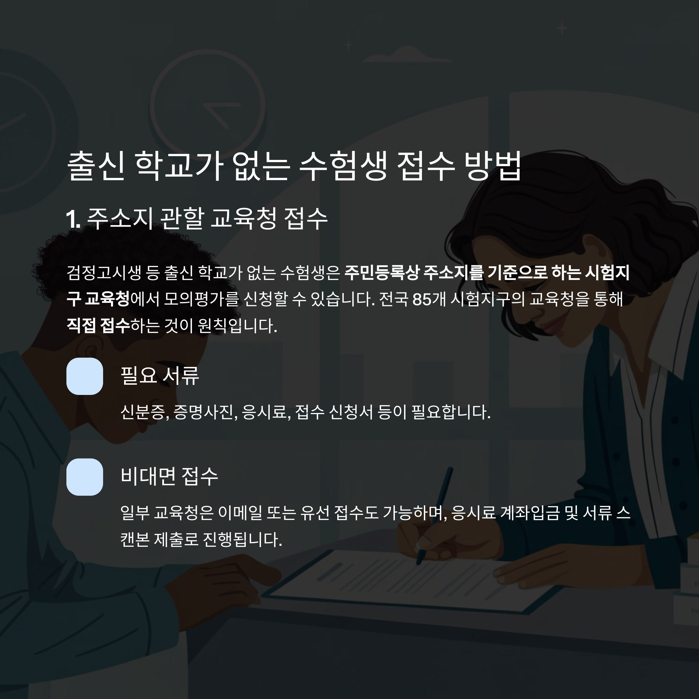 출신 고등학교가 없는 수험생, 예를 들어 검정고시 합격자, 해외 귀국생, 기타 학력 인정자의 경우에는 다음과 같은 경로로 2026학년도 9월 모의평가에 접수할 수 있습니다.