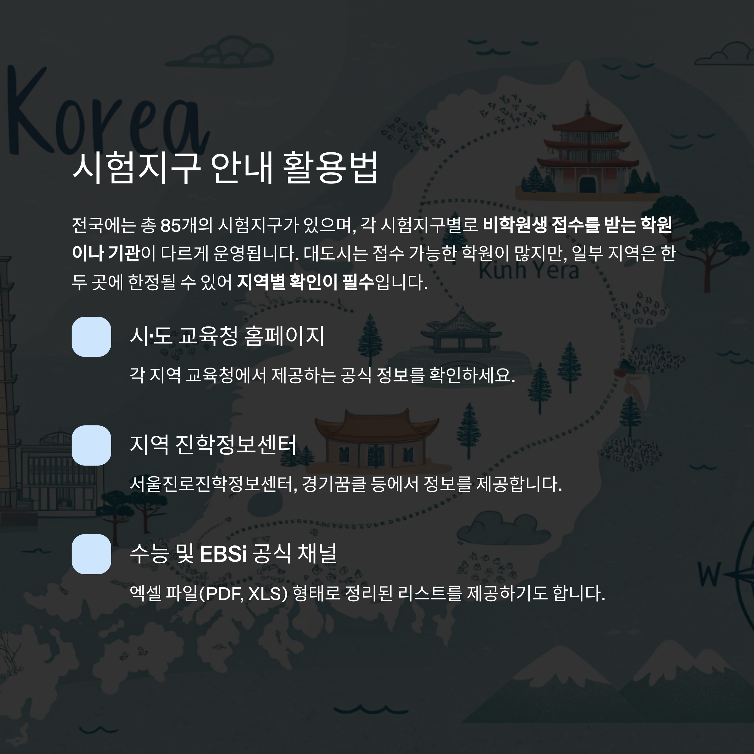 일부 교육청은 엑셀 파일(PDF, XLS 등) 형태로 정리된 ‘비학원생 접수 가능 학원 리스트’를 제공하기도 하므로 활용도가 높습니다.