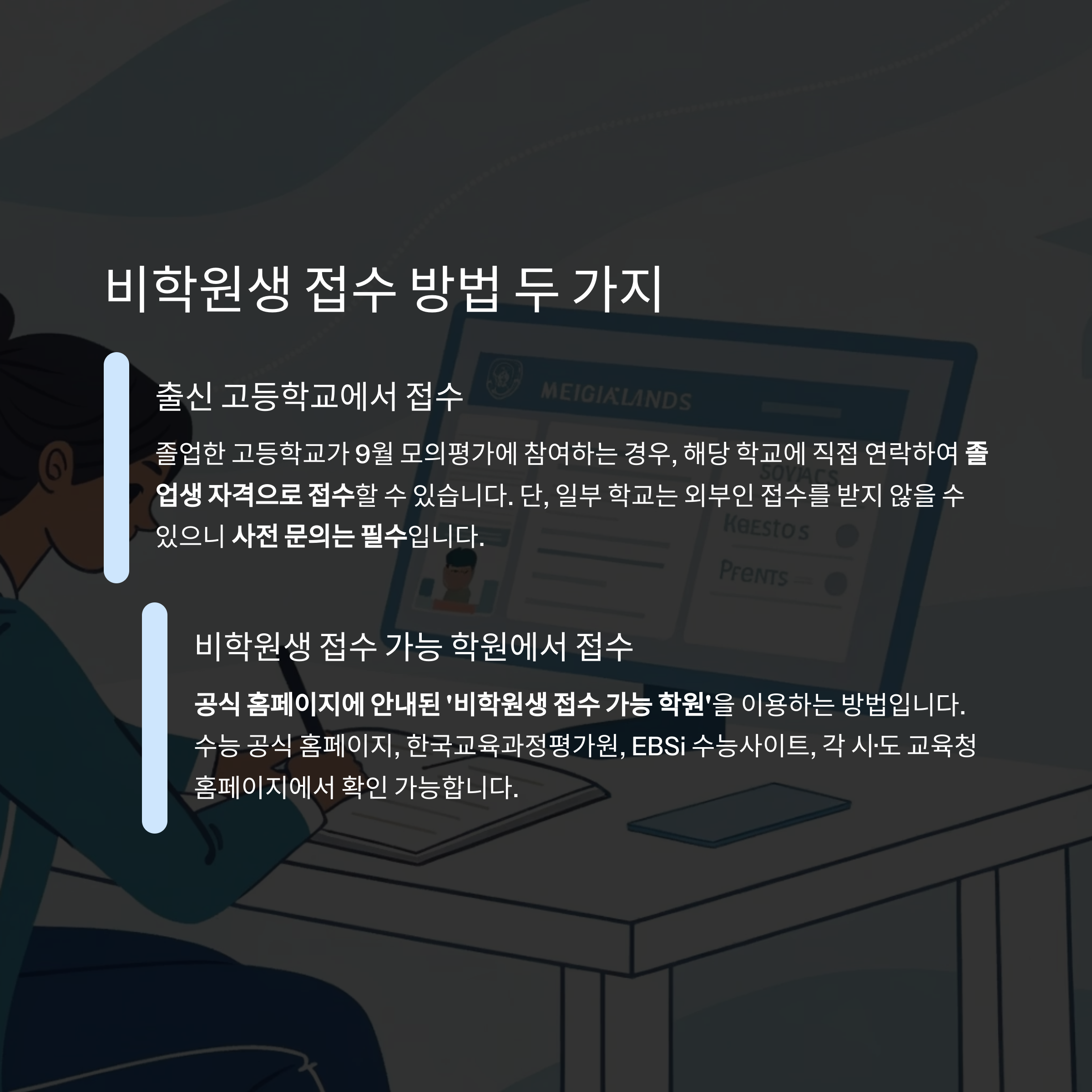 9월 모의평가에 접수하고자 하는 비학원생은 다음 두 가지 방법 중 선택하여 접수할 수 있습니다.