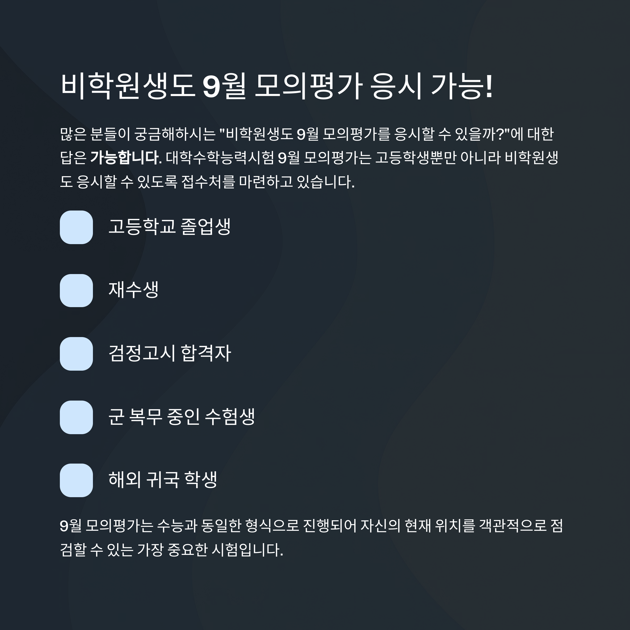 많은 분들이 궁금해하는 부분 중 하나는 바로 "비학원생도 9월 모의평가를 응시할 수 있을까?"입니다. 결론부터 말하자면, 가능합니다. 대학수학능력시험 9월 모의평가는 고등학생뿐만 아니라 비학원생도 응시할 수 있도록 접수처를 마련하고 있습니다.