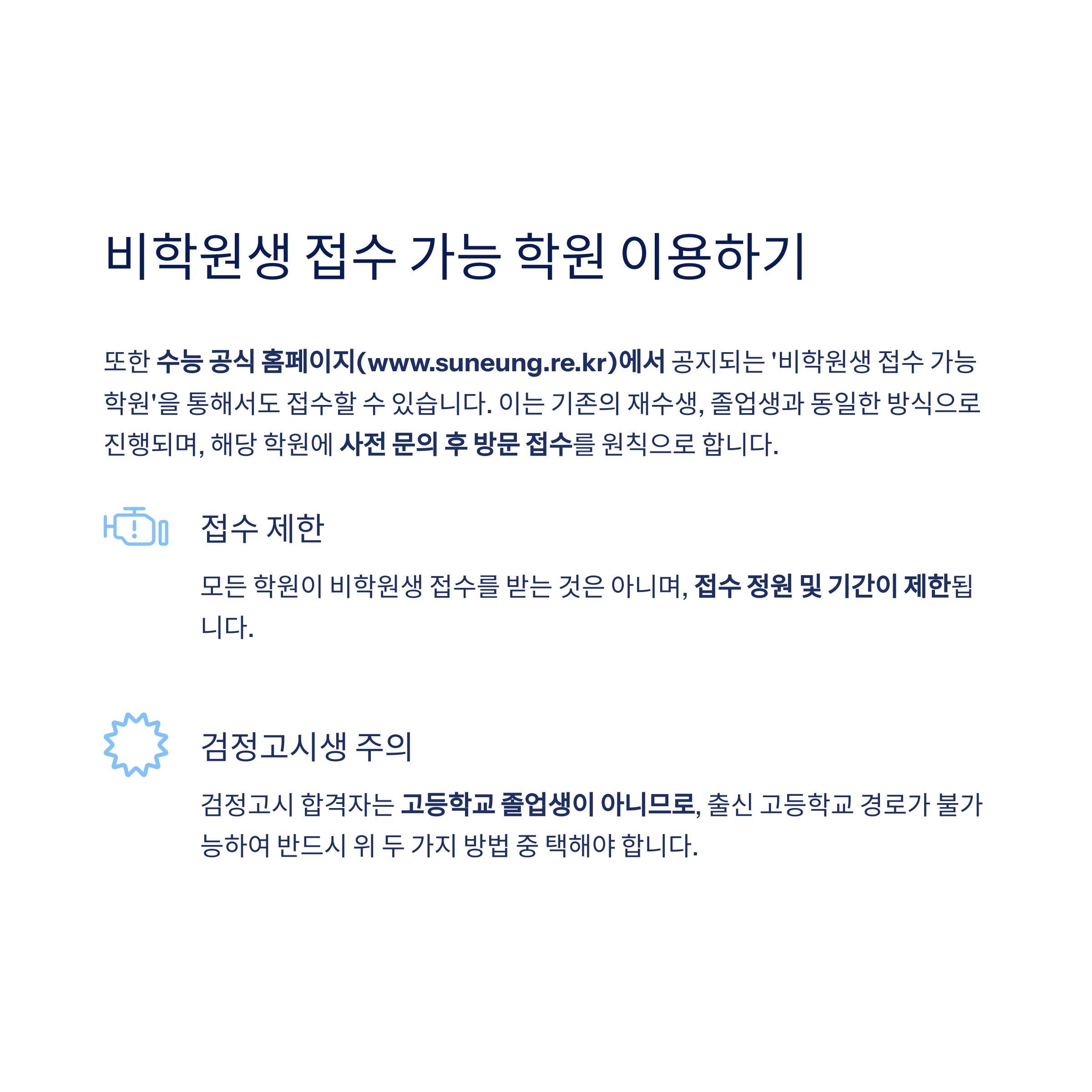 특히 비학원생 여러분은 접수에 있어 정보 부족과 절차상의 어려움을 겪기 쉬우므로, 반드시 사전 확인과 준비가 중요합니다.
