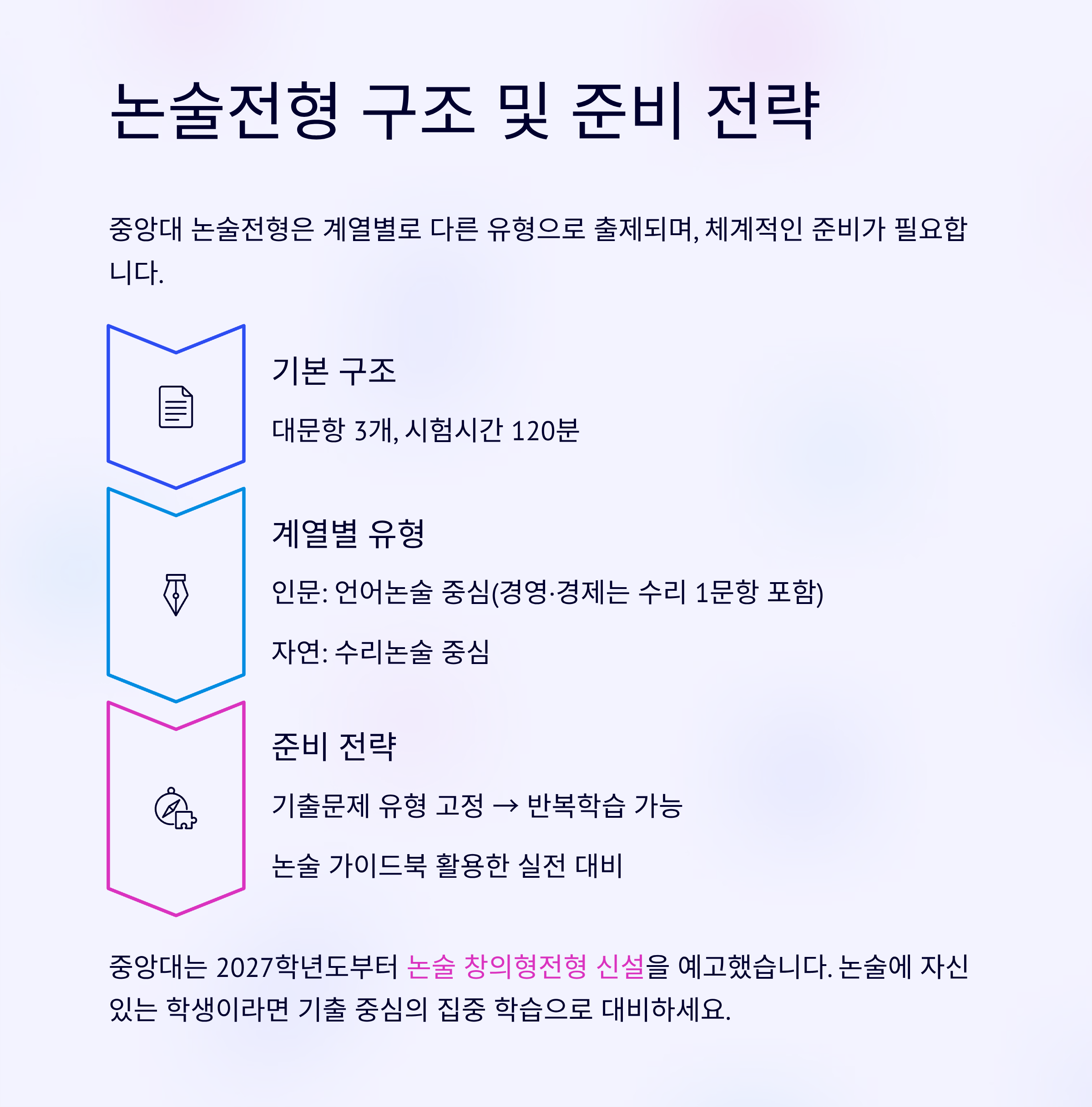 중앙대 논술전형은 대문항 3개, 시험시간 120분으로 구성되며, 계열별로 유형이 다릅니다.