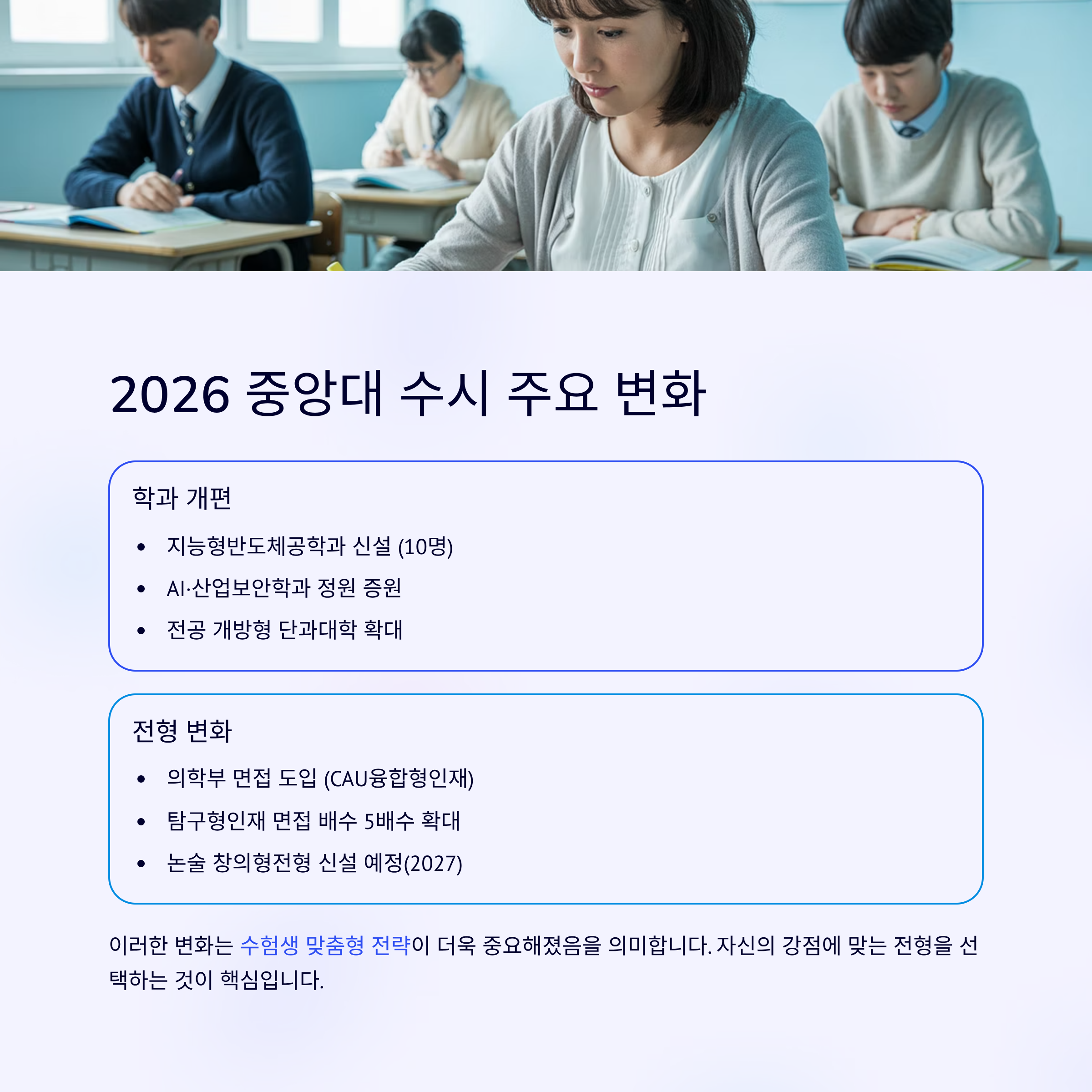 중앙대는 2026학년도 수시에서 첨단학과 신설, 전형 구조 개편, 면접 배수 확대 등 다양한 변화를 예고했습니다.