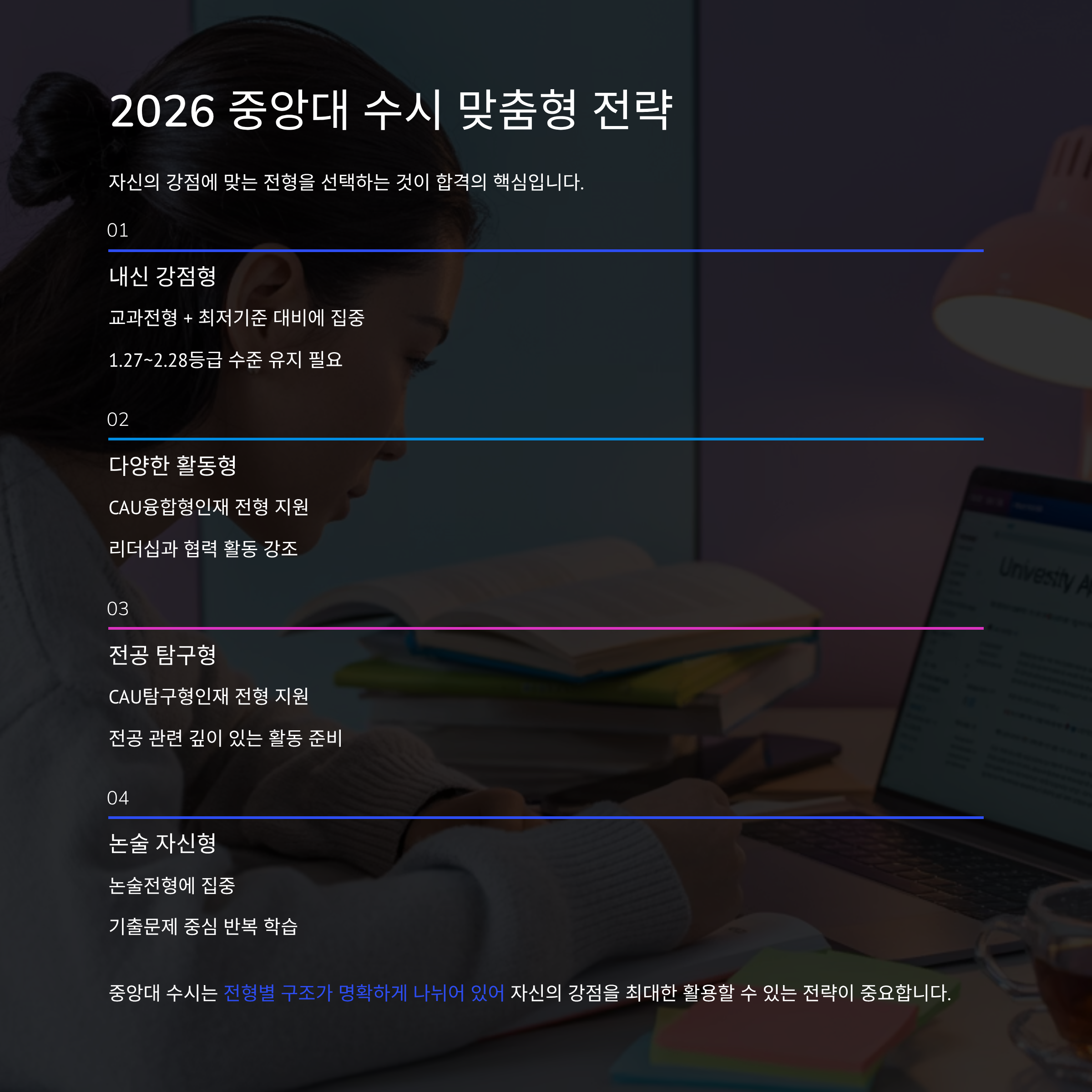 이번 글에서는 2026학년도 중앙대 수시 전형의 핵심 정보와 전략을 총정리해드립니다.